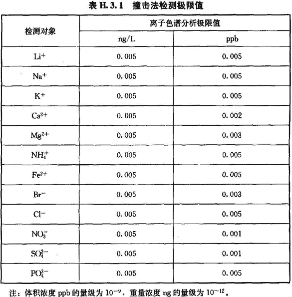 H.3.1 撞擊采樣法適用于檢測空氣中的陰陽離子(Li+、Na+、K+、Ca2+、Mg2+、Fe2+、Br-、Cl等)的濃度。檢測限值可按表H.3.1執行。