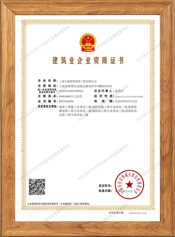上海天瀾建筑裝飾工程有限公司是上海工商行政管理局注冊登記的專業(yè)上海工裝公司。我司主要從事凈化車間工程、廠房辦公室工程、鋼結(jié)構(gòu)搭建工程餐飲娛樂工程酒店公寓工程、展覽展示工程等業(yè)務。我司是建筑工程施工總承包三級消防設(shè)施工程專業(yè)承包二級,建筑裝修裝飾工程專業(yè)承包二級,鋼結(jié)構(gòu)工程專業(yè)承包三級,建筑機電安裝工程專業(yè)承包三級、上海市建設(shè)和交通委員會頒發(fā)的“安全生產(chǎn)許可證”公司自成立以來堅持“質(zhì)量是企業(yè)生命信譽是發(fā)展之道、服務是競爭之魂”發(fā)展理念。公司擁有優(yōu)秀的服務團隊、在潛心服務客戶中在不斷經(jīng)營發(fā)展中樹立了良好的企業(yè)形象和口碑。